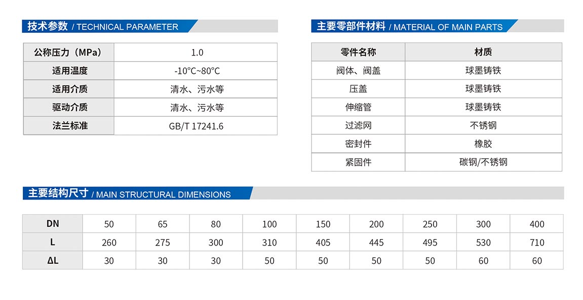 伸縮過濾器是過濾器和伸縮接頭的組合,它也是輸送介質(zhì)管道上不可缺少的一種裝置,通常安裝在減壓閥、泄壓閥、定水位閥或其它設(shè)備的進(jìn)口端。當(dāng)管道中的介質(zhì)進(jìn)入過濾器時(shí),介質(zhì)通過濾網(wǎng)進(jìn)入被連接的閥門中,而雜質(zhì)則留于過濾桶內(nèi),使各類閥門不會(huì)由于機(jī)械雜物卡入密封圈而失靈。另加不銹鋼伸縮拉桿,補(bǔ)償管道尺寸,安裝靈活。