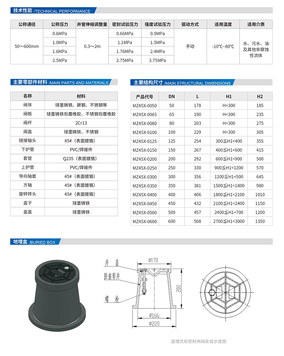 直埋式軟密封閘閥由閥門、地埋裝置(包括伸縮桿、伸縮護套、地埋盒)等部分組成。其閥門部分除了具有軟密封閘閥的所有特點之外,還具備先進的烤漆層防腐技術,閥體不會生銹,確保三十年免維護。由于軟密封閘閥使用壽命長,性能穩(wěn)定,在軟密封閘閥基礎上添加了一個伸縮桿、伸縮護套,并配以地埋盒,形成直埋式軟密封閘閥,特點如下: